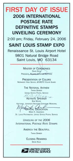 St Louis Stamp Expo (EXPO) Show has hosted several of the USPS’s Official First Day of Issue Ceremonies over the years of the show. Hosting one of these ceremonies is an honor and special event where the USPS, the stamp’s designer, philatelists, and special philatelic organizations are gathered to introduce a new stamp to the country.